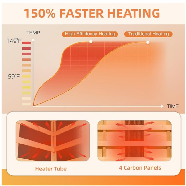 【เทคโนโลยีความร้อนที่มีประสิทธิภาพ】ติดตั้งคาร์บอน 4 แผงและท่อคาร์บอน 1 หลอดซาวน่าอินฟราเรด 1 คนของเราให้ความร้อนรอบทิศทาง 360 องศาทำให้มั่นใจได้ว่าการกระจายความร้อน โดยทั่วไปแล้วมันจะร้อนขึ้นในเวลาเพียง 10-15 นาทีทำให้คุณเพลิดเพลินไปกับประสบการณ์ซาวน่าโดยไม่ชักช้า