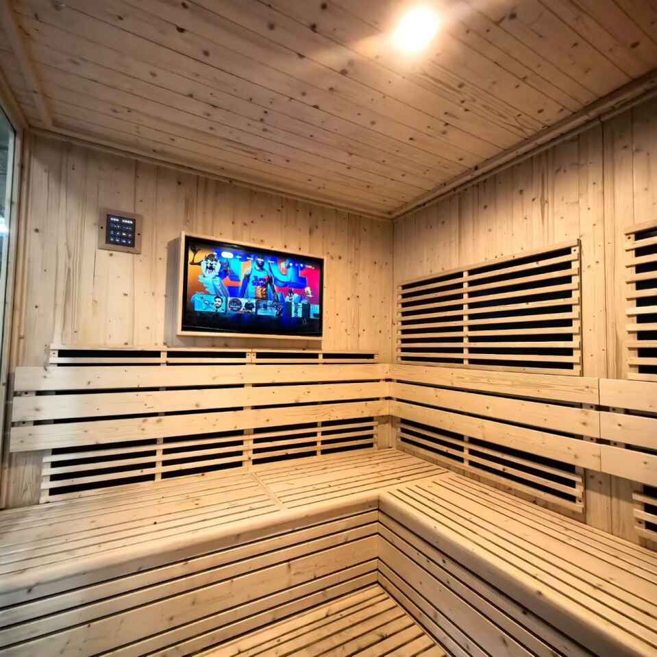 ทีวี LCD ในตัว (มองเห็นได้ในภาพ) เปลี่ยนประสบการณ์ซาวน่า: