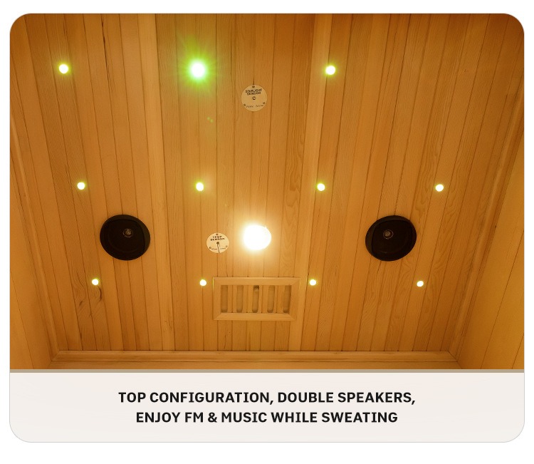 ด้านบนมีระบบลำโพงคู่ รองรับวิทยุ FM และเล่นเพลง คุณสามารถเพลิดเพลินกับท่วงทำนองหรือรายการวิทยุที่คุณชื่นชอบในขณะที่เหงื่อออก ยกระดับประสบการณ์ซาวน่าที่ดื่มด่ำ