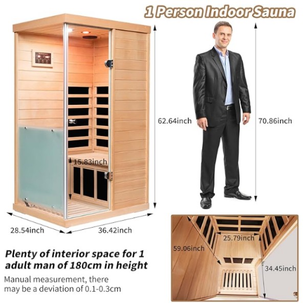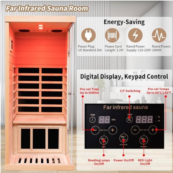 · 【Security, Use with Confidence】: Digital display, button control system, time and temperature can be set, the preset time is up to 60 minutes, and the preset temperature is up to 60° (140℉). Humanized temperature control system, temperature protection 110°.If an electrical leakage occurs during the use of our far infrared sauna , the protection device automatically cuts off the power supply.