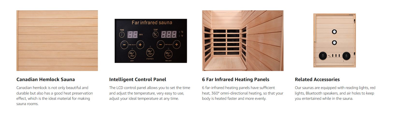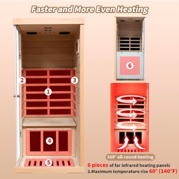 · 【การทำความร้อนรอบด้าน 360° พร้อมระบบความบันเทิงอัจฉริยะ】: เมื่อเปรียบเทียบกับซาวน่าในร่มอื่นๆ เรามีแผงทำความร้อนอีพ็อกซี่อินฟราเรดฟาร์อินฟราเรด 6 แผง ให้ความร้อนเร็วขึ้นและสม่ำเสมอยิ่งขึ้น โดยมีอุณหภูมิเพิ่มขึ้นสูงสุด 60° (140°F) คุณจึงไม่ต้องกังวลเรื่องความร้อนไม่เพียงพออีกต่อไป ติดตั้งไฟอ่านหนังสือ LED 1 อัน, ไฟสีแดง 1 อัน และลำโพงบลูทูธ 1 อัน (ชื่ออุปกรณ์บลูทูธ: ลำโพง BT) คุณสามารถอ่านและฟังเพลงขณะอยู่ในซาวน่าได้
